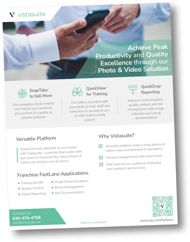 Franchise FastLane has partnered with Vistasuite to provide the following solutions for your business. Vistasuite provides a very simply way to leverage the power and efficiency photos and videos can provide in operations and sales.
